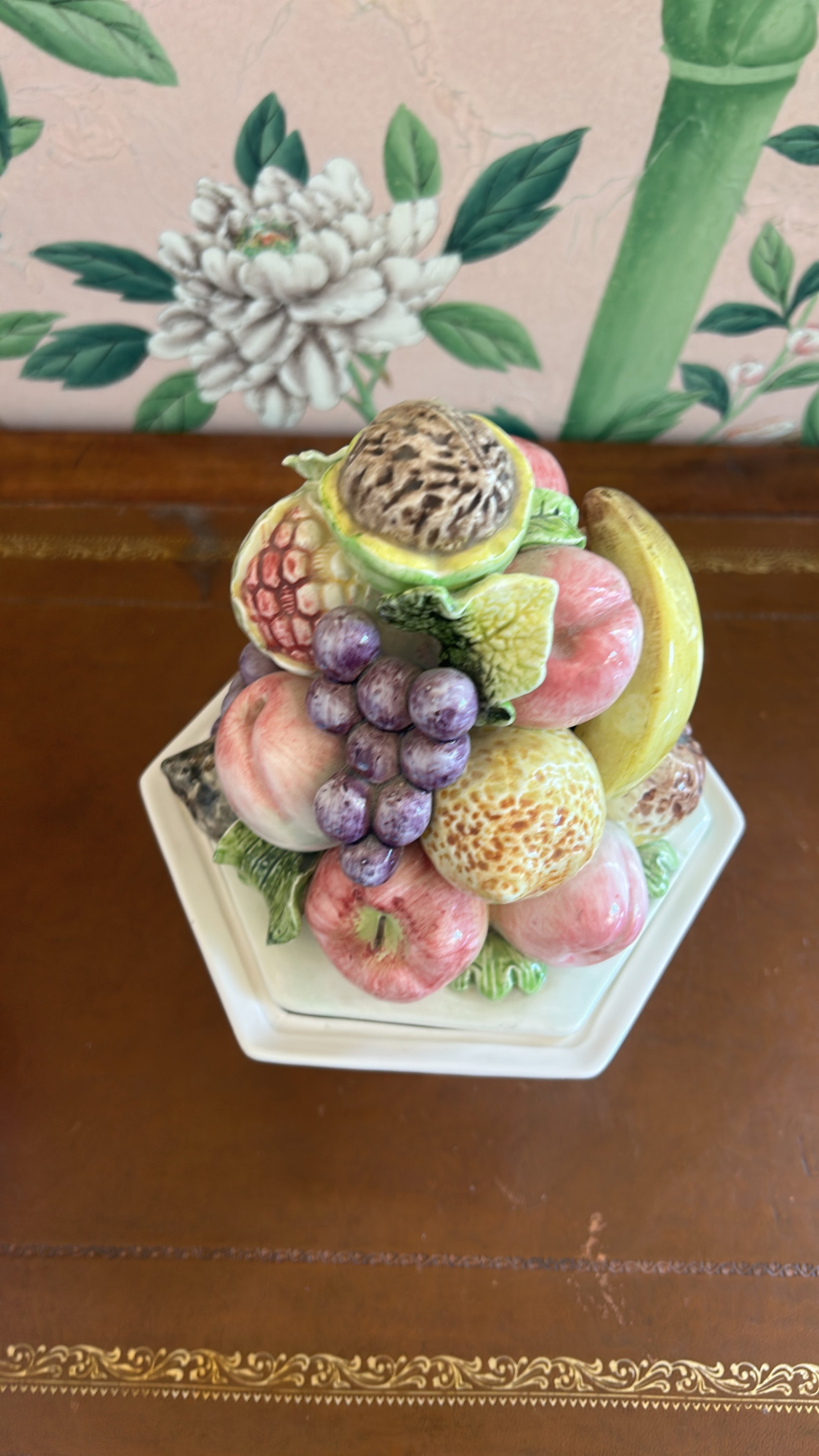 1960s Italian fruit topiary footed box compote. Top fruit topiary comes off. Hand painted glazed ceramic finish. Excellent condition & super rare design. Mix of fruits with top avocado beautiful details. Approx 11 tall x 8 dia.