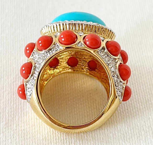 Classic KJL Kenneth Jay Lane signed designer cocktail ring. Beautiful turquoise & coral cabochons with rhinestone accents in a gold metal finish. Signed on the inside. We are uncertain of the size / we are working on getting aa ring sizer. It’s goes down to my knuckle on my pinky finger. Over all approx .75” tall x 1” wide front face size. Like new condition. 140 plus 8 shipping