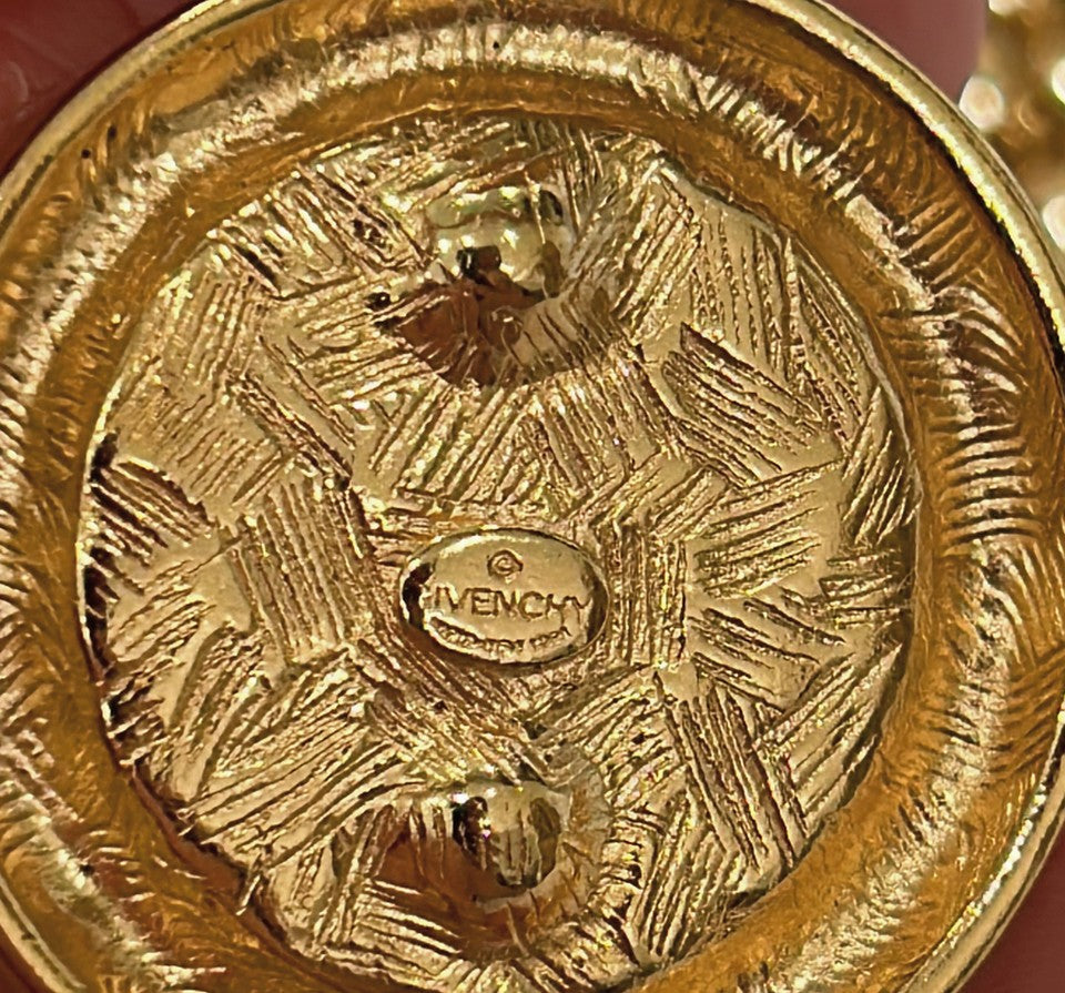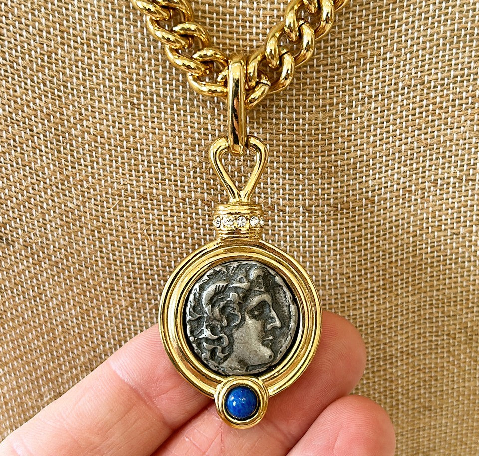 Classic signed Givenchy statement coin Cain necklace. 1980s collection made for Neiman Marcus. Original price tag still attached. Probably never worn. Larger coin pendant approx 2.5 tall x 1.25 wide. Blue cabachon stone accent with rhinestone accents at the top. Approx 13 long when closed. Classic double Gs check clasp.