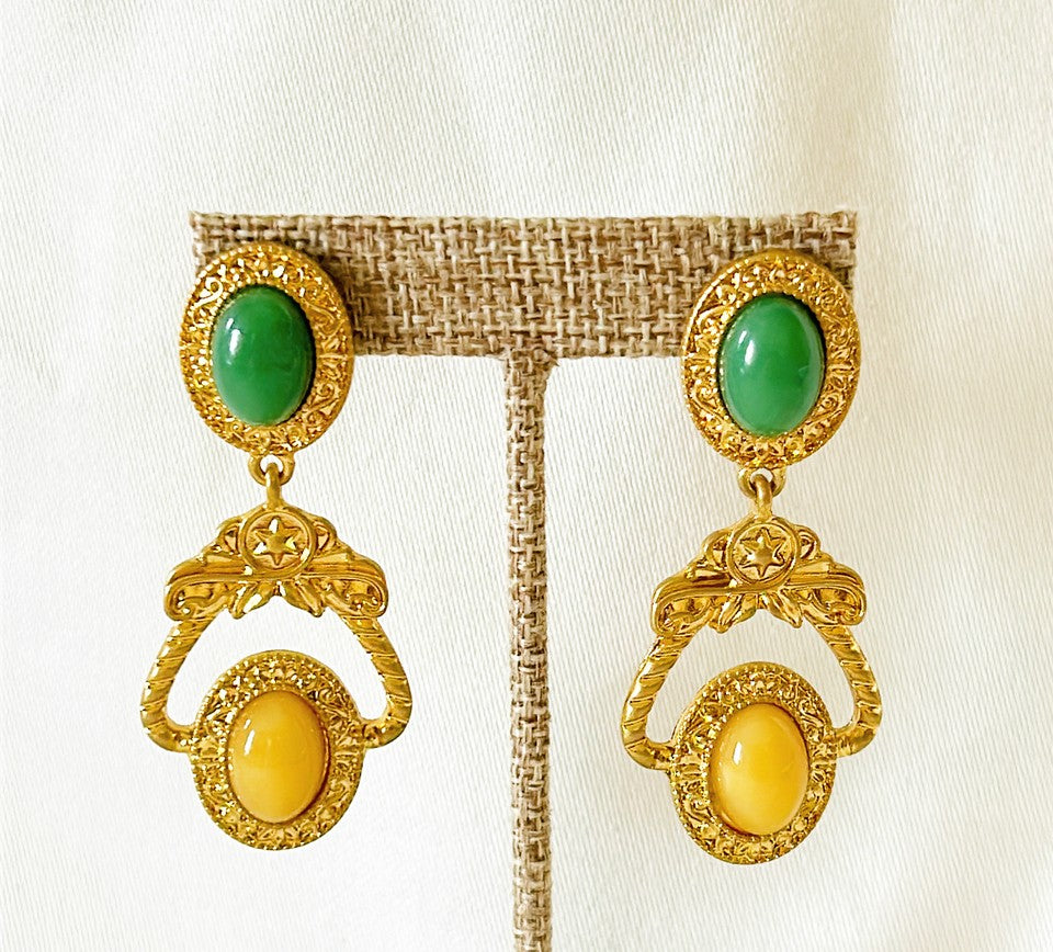 Fabulous large statement pierced earrings with dangling style bottom La. Fabulous quality with jade green & cream faux stone accents. Approx 2.5 tall x 1.25 wide. 82 plus 8 shipping
