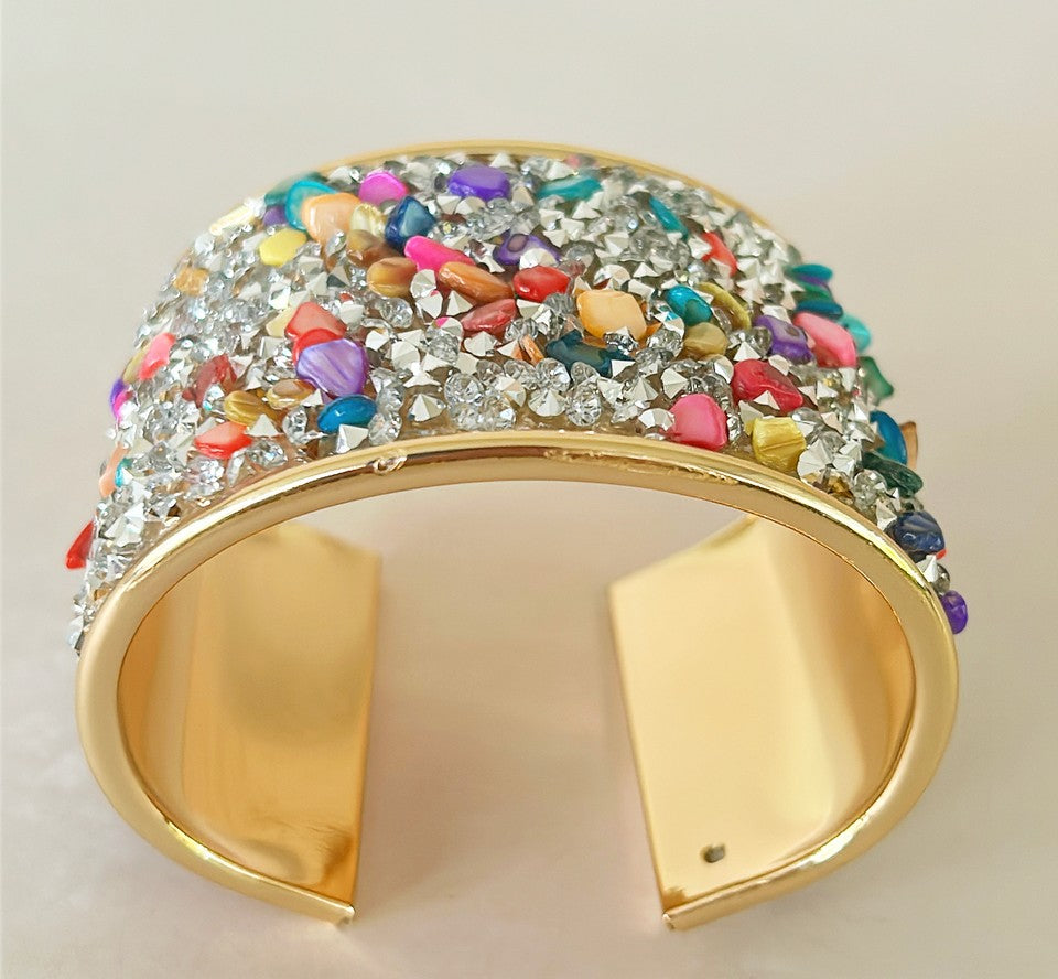 Fun statement cuff bracelet - thick in a gold tone metal finish with stone cluster style design with crushed rhinestones & multi colored faux mother of pearl stones. Approx 1.75 thick x 2.75 x 2.25.
