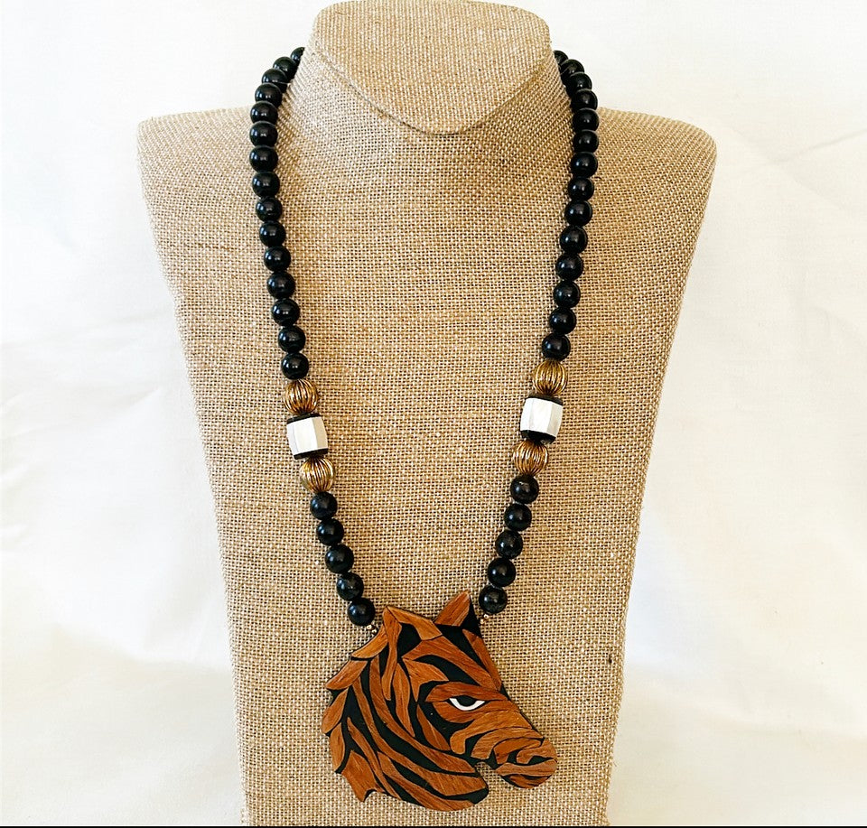 How fun is this? 1980s designer style black beaded necklace with wooden carved lacquered zebra pendant.