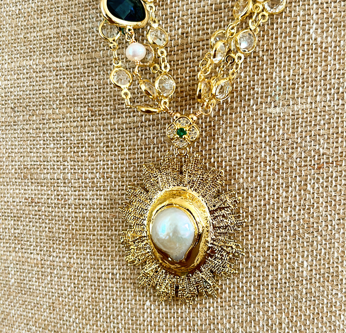 Multi strand layered statement necklace. Faux pearls mixed with faux multi colored gemstones. Gold metal frame setting with clear crystal link chains. Approx 22 long fully opened. Faux fresh water style pearl starburst style pendant approx 2 tall x 1.25 wide.