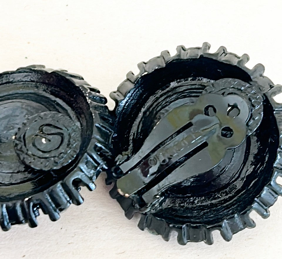 Signed St. John Rare jet back crystal clip on earrings. Black metal finish frame settings with large center black crystal and side blank crystal accents. Approx 1.25” dia.
