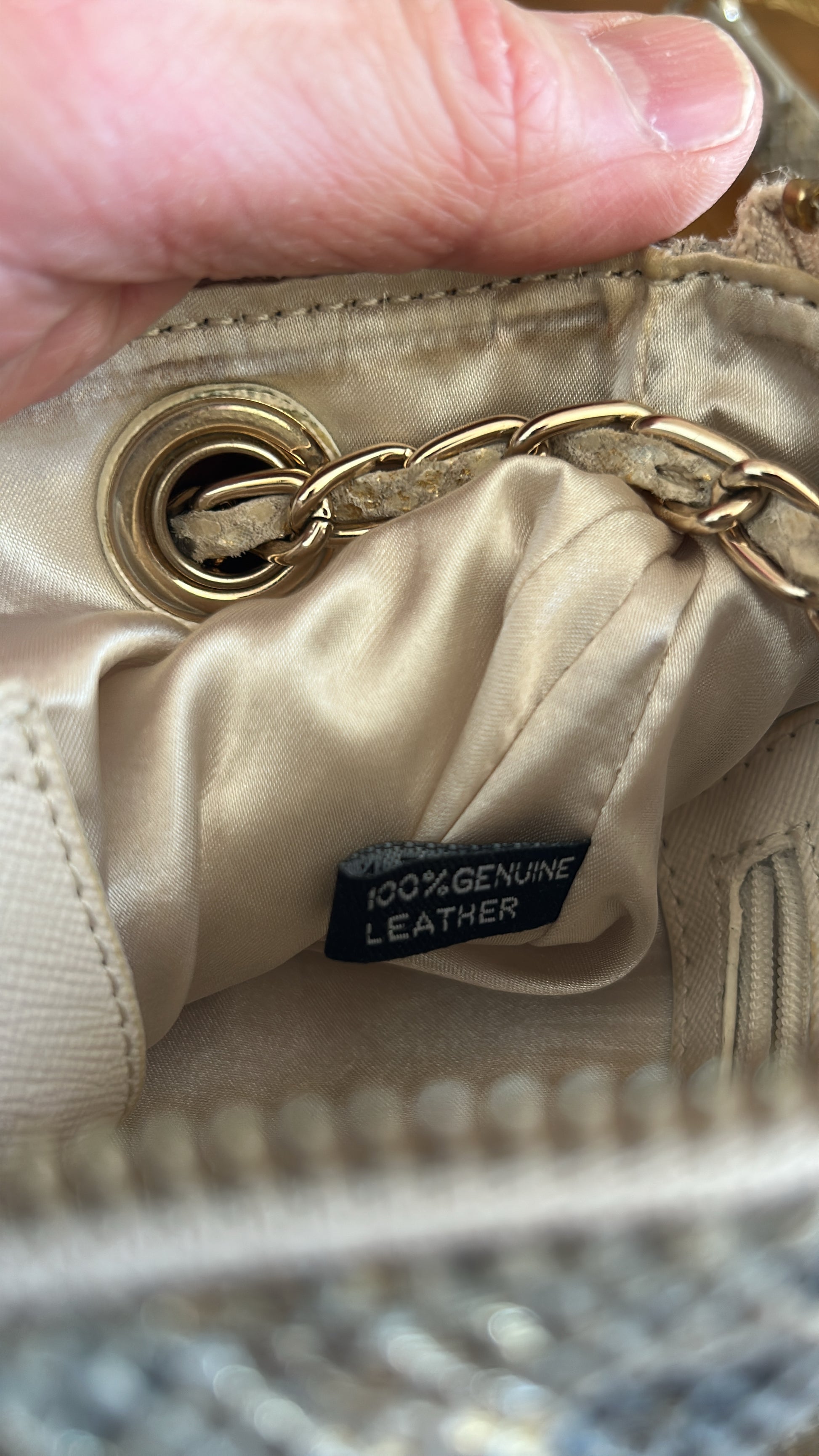 Vintage DKNY genuine leather faux snake skin purse. Textured in a natural looking snake skin with a metallic gold accent on the finish. Never used. Still has purse bag. Bag approx 11 wide x 6.5 tall. Like new condition. Great details. Heavy chain style double shoulder strap.
